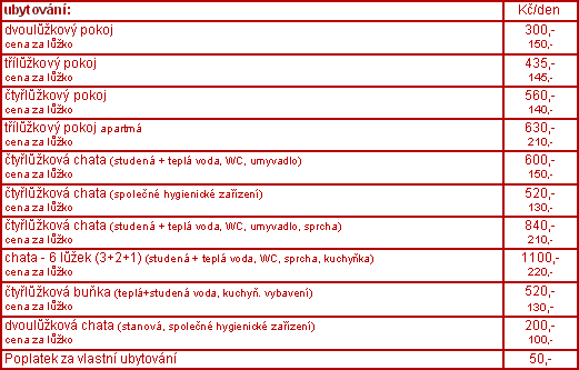 Sjíždíme se v pátek odpoledne kolem páté hodiny. Stravování je zajištěno v místní restauraci, poplatek za ubytování v chatkách dle ceníku: